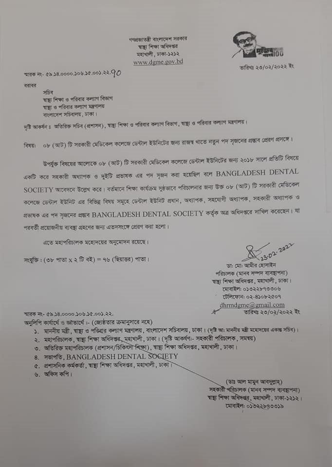 স্বাস্থ্য শিক্ষা অধিদপ্তরের মানব সম্পদ ব্যবস্থাপনা বিভাগের পরিচালক ডা. মো. আমীর হোসাইন স্বাক্ষরিত এক বিজ্ঞপ্তিতে বলা হয়, ‘উপর্যুক্ত বিষয়ের আলোকে আটটি সরকারি মেডিকেল কলেজে ডেন্টাল ইউনিটের জন্য ২০১৮ সালে প্রতিটি বিষয়ে একটি করে সহকারী অধ্যাপক ও দুইটি প্রভাষকের পদ সৃজন করা হয়েছিল বলে বাংলাদেশ ডেন্টাল সোসাইটি আবেদনে উল্লেখ করে। বর্তমান শিক্ষা কার্যক্রম সুষ্ঠভাবে পরিচালনার জন্য উক্ত আটটি সরকারি মেডিকেল কলেজের ডেন্টাল ইউনিটের বিভিন্ন বিষয় সমূহে ডেন্টাল ইউনিট প্রধান, অধ্যাপক, সহযোগী অধ্যাপক ও প্রভাষকের পদ সৃজনের প্রস্তাব বাংলাদেশ ডেন্টাল সোসাইটি কর্তৃক অত্র অধিদপ্তরের দাখিল করেছেন। যা পরবর্তী প্রয়োজনীয় ব্যবস্থা গ্রহণের জন্য প্রেরণ করা হলো। এতে মহাপরিচালক মহোদয়ের অনুমোদন রয়েছে।’