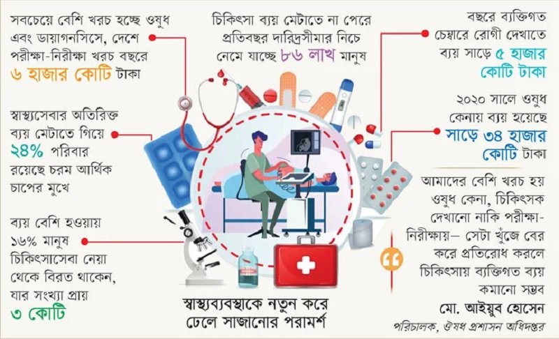 দেশের স্বাস্থ্য অর্থনীতি ইউনিটের তথ্য বলছে, বর্তমানে একজন রোগীর পেছনে যে ব্যয় হয়, তার ৭৩ শতাংশই সেবাগ্রহীতা ব্যক্তিকে বহন করতে হয়। চিকিৎসার এই ব্যয়ভার বহন করতে গিয়ে প্রতিবছর দেশে ৮৬ লাখ মানুষ আর্থিক সমস্যায় পড়েন। ব্যয় বেশি হওয়ার কারণে ১৬ শতাংশ মানুষ স্বাস্থ্যসেবা নেওয়া থেকে বিরত থাকেন। অর্থাৎ প্রায় তিন কোটি মানুষ প্রয়োজন হলেও চিকিৎসকের কাছে বা হাসপাতালে যান না। একজন রোগীকে সরকারি বা বেসরকারি হাসপাতালে গিয়ে রোগ নির্ণয়ের জন্য বিভিন্ন ধরনের পরীক্ষা-নিরীক্ষা করতে হয়। চিকিৎসকের ফি ছাড়াও প্যাথলজি টেস্ট, ওষুধ, হাসপাতালের আনুষাঙ্গিক খরচ এমনকি যাতায়াতসহ নানাভাবে একজন রোগীকে অন্তত ৭৫ শতাংশ খরচ গুণতে হয়, যা কাছের দেশে মালদ্বীপে মাত্র ২০ শতাংশ। ওই দেশে চিকিৎসা সেবার পেছনে রোগীকে শতকরা ২০ টাকা হারে ব্যয় করতে হয়। সেই তুলনায় বাংলাদেশে এই খরচ বৃদ্ধির হার প্রায় ৫৫ শতাংশ বেশি।