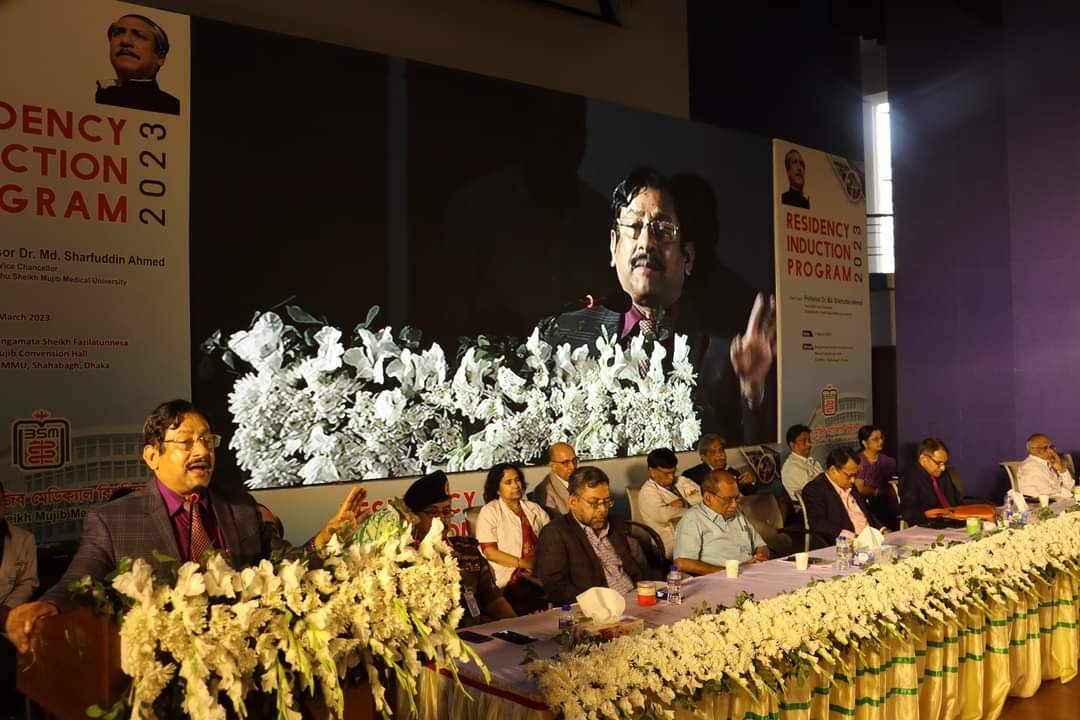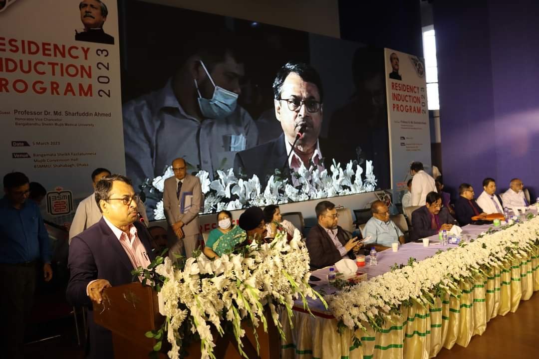 গুরুত্বপূর্ণ এই ইনডাকশন প্রোগ্রামে বঙ্গবন্ধু শেখ মুজিব মেডিক্যাল বিশ্ববিদ্যালয়ের উপাচার্য অধ্যাপক ডা. মোঃ শারফুদ্দিন আহমেদ নবাগত রেসিডেন্টদের উদ্দেশ্যে বলেন, জীবনে সততা, নৈতিকতাকে ধারণ করে ডিসিপ্লিন মেনে চলতে হবে, তবেই সফলতা আসবে। তিনি তাঁর বক্তব্যে বিশ্ববিদ্যালয়ের বিভিন্ন অর্জনসমূহ তুলে ধরেন এবং নবাগত রেসিডেন্ট চিকিৎসকদের সুদক্ষ বিশেষজ্ঞ চিকিৎসক হিসেবে গড়ে তোলার আহ্বান জানান।