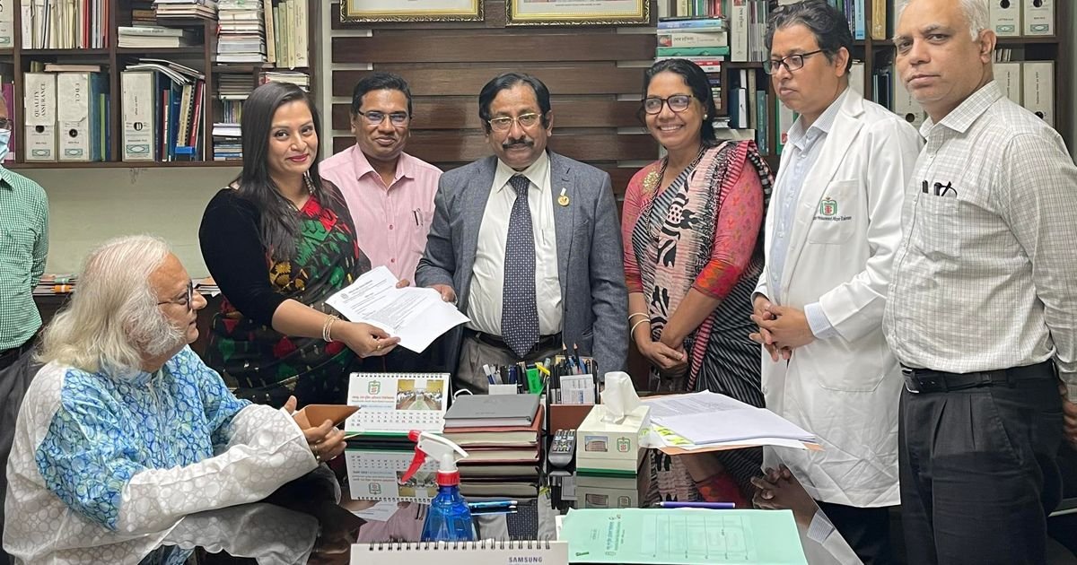 মঙ্গলবার সকালে ডা. ফাতিমা জোহুরার হাতে নিয়োগপত্র তুলে দেন বিএসএমএমইউয়ের উপাচার্য অধ্যাপক ডা. মো. শারফুদ্দিন আহমেদ। ছবি: সংগৃহীত