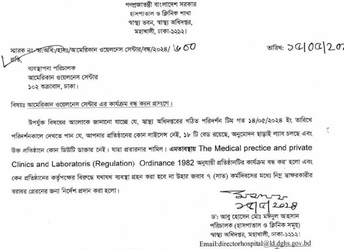 বুধবার (১৪ মে ২০২৪) আমেরিকান ওয়েলনেস সেন্টারের ব্যবস্থাপনা পরিচালক বরাবর স্বাস্থ্য অধিদপ্তরের পরিচালক (হাসপাতাল ও ক্লিনিক সমূহ) ডা. আবু হোসেন মো. মঈনুল আহসান স্বাক্ষরিত পাঠানো এক চিঠিতে এই তথ্য জানানো হয়েছে।