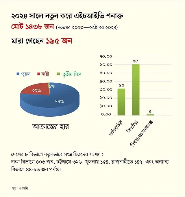 দেশে গত এক বছরে (২০২৩ সালের নভেম্বর থেকে চলতি বছরের অক্টোবর) ১ হাজার ৪৩৮ জন নতুন করে এইডসে আক্রান্ত হয়েছেন। এ বছর এইডসে মারা গেছেন ১৯৫ জন। বাংলাদেশে ১৯৮৯ সালে প্রথম এইচআইভি (এইডসের ভাইরাস) পজিটিভ ব্যক্তি শনাক্ত হয়। এর মধ্যে এবার এইডসে আক্রান্তের সংখ্যা সর্বোচ্চ।