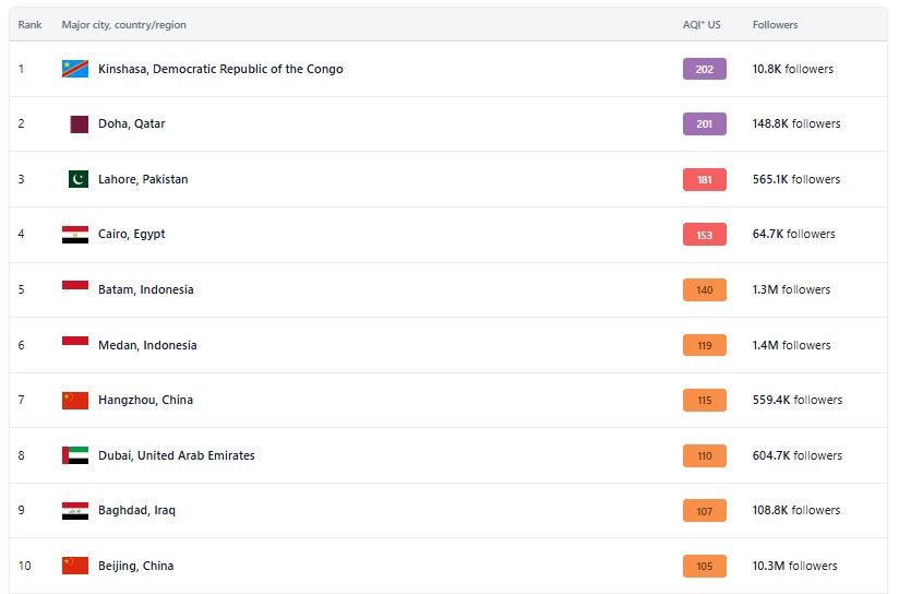এ ছাড়া আজ ২০১ স্কোর নিয়ে দ্বিতীয় অবস্থানে রয়েছে কাতারের রাজধানী দোহা এবং ১৮১ স্কোর নিয়ে তৃতীয় অবস্থানে রয়েছে পাকিস্তানের লাহোর শহর। ১৫৩ স্কোর নিয়ে চতুর্থ অবস্থানে রয়েছে মিশরের রাজধানী কায়রো। আর ১৪০ স্কোর নিয়ে পঞ্চম অবস্থানে রয়েছে ইন্দোনেশিয়ার বাতাম শহর।