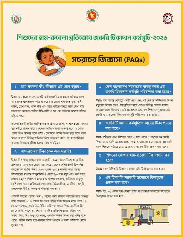 দেশে হাম রোগের প্রাদুর্ভাব বৃদ্ধি পাওয়ায় ৬ মাস থেকে ৫ বছরের কম বয়সী শিশুদের জন্য জরুরি হাম-রুবেলা টিকাদান কর্মসূচি শুরু করেছে সরকার। এই কর্মসূচি ঘিরে অভিভাবকদের মধ্যে নানা প্রশ্ন ও উদ্বেগ তৈরি হয়েছে।
