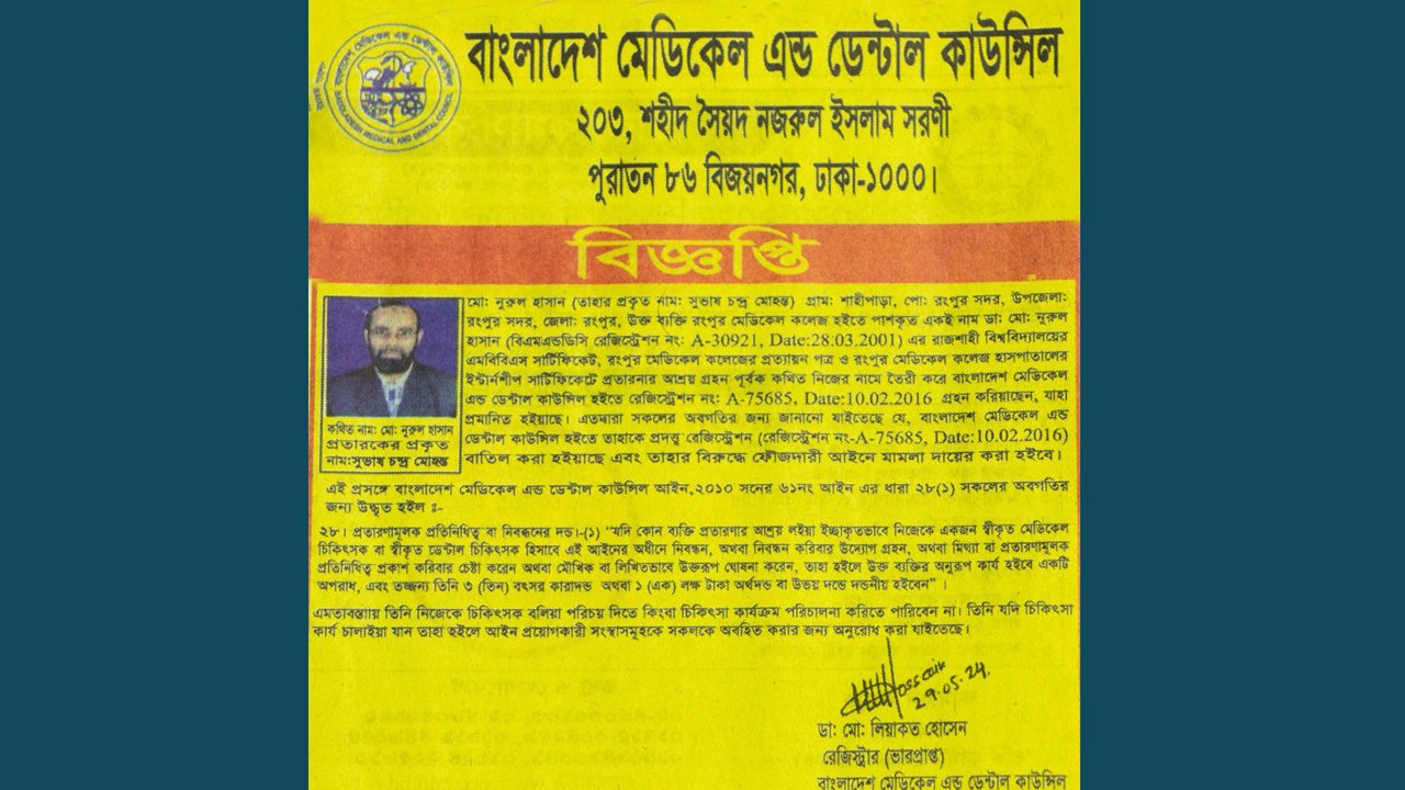 রংপুর মেডিকেল কলেজের থেকে এমবিবিএস সম্পন্ন করা ডা. মো. নূরুল হাসানের তথ্য ব্যবহার করে জেলার সুভাষ চন্দ্র মোহস্ত নামে এক ব্যক্তির বিরুদ্ধে বাংলাদেশ মেডিকেল অ্যান্ড ডেন্টাল...